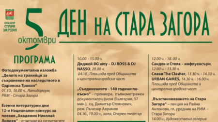 От днес, 1 октомври, започва поредицата от събития, посветени на Празника на Стара Загора - Пети октомври.