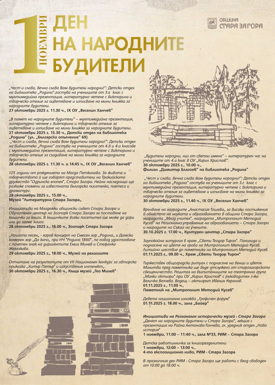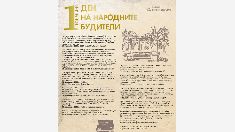 Събитията, посветени на Деня на народните будители в Стара Загора започват от 27 октомври 2025 г., когато детският отдел на библиотека "Родина" ще гостува на третокласниците от Основно училище "Веселин Ханчев". Това обяви пресцентърът на Община Стара Загора.