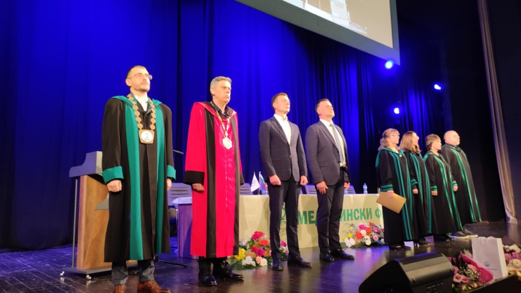 Поздравления към новозавършилите лекари бяха прочетени от Българския лекарски съюз, от Регионалната здравна инспекция, от други медицински университети, а председателят на Районната лекарска колегия д-р Любомир Трифонов покани дипломираните медици да станат членове на организацията.