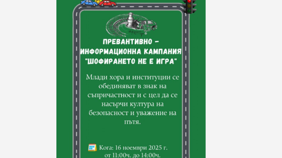 Световният ден за възпоменание на жертвите от пътнотранспортни произшествия ще бъде отбелязан днес в Стара Загора с информационна кампания под мотото „Шофирането не е игра“. Целта на инициативата е да повиши информираността за пътната безопасност и да намали риска от пътни инциденти.