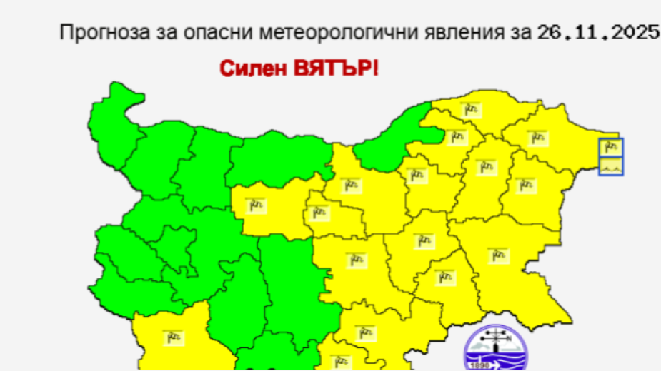 Жълт код да силен вятър е обявен за областите Благоевград, Плевен, Ловеч, Габрово, Велико Търново, Търговище, Шумен, Силистра, Добрич, Варна, Бургас, Ямбол, Хасково и Кърджали.