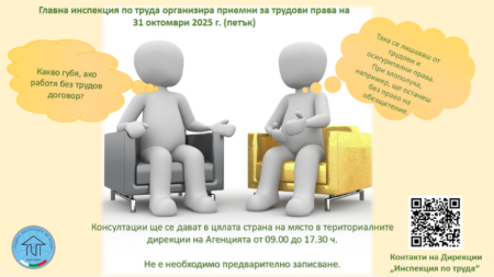 Главна инспекция по труда ще проведе приемни за трудови права във всички териториални дирекции в страната. Консултациите са от 09:00 до 17:30 ч., без предварително записване . Гражданите ще могат да получат информация относно спазването на трудовото законодателство, включително здравословни и безопасни условия на труд. От началото на годината..