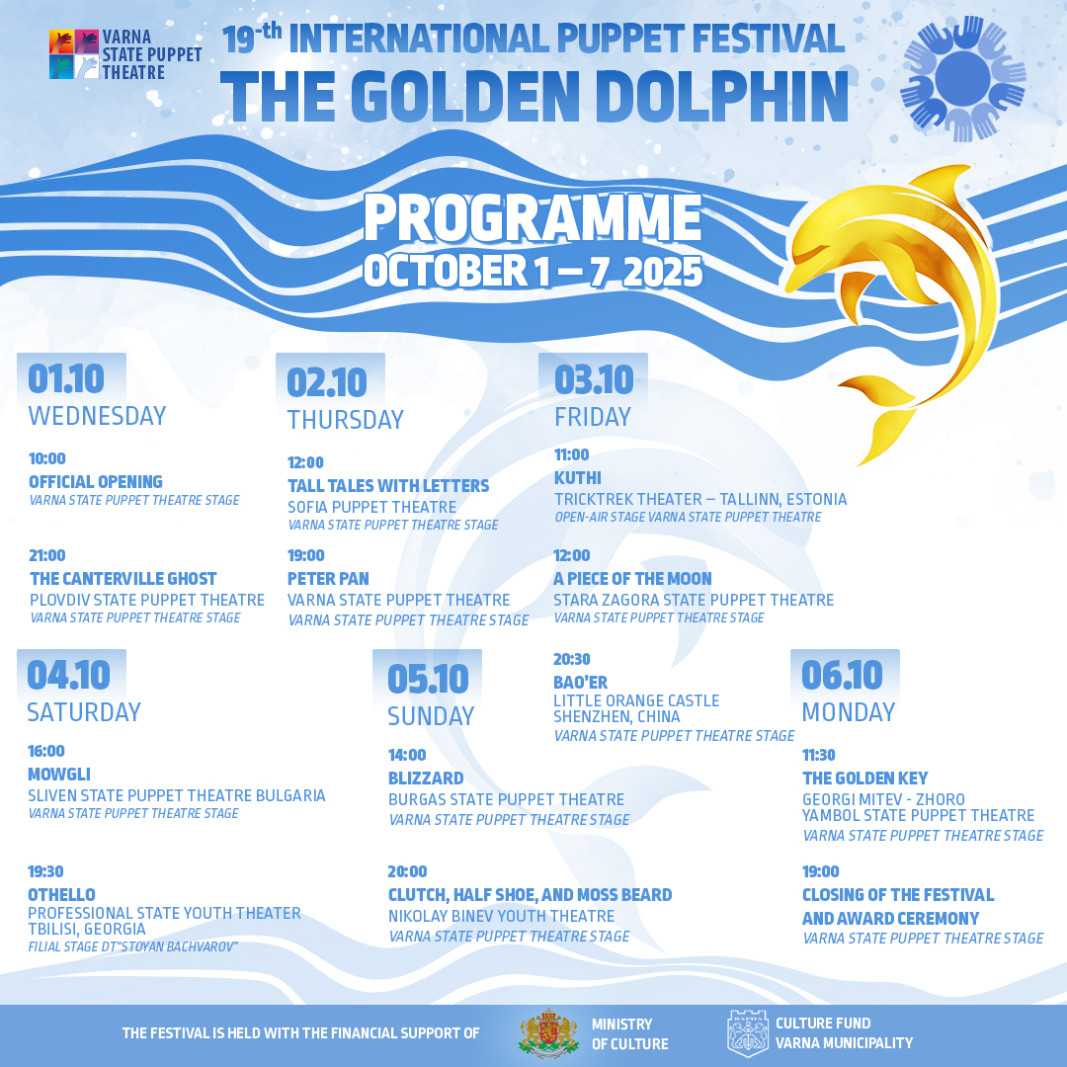 От 1 до 7 октомври Варна ще бъде сцена на XIX Международен куклен фестивал "Златният делфин". МКФ "Златният делфин" е първият фестивал за куклено изкуство в България, създаден във Варна през 1972 г. от Държавен куклен театър - Варна. Оттогава, на всеки 3 години фестивалната сцена събира изявени театри от страната и света и среща публиката с магичното им..