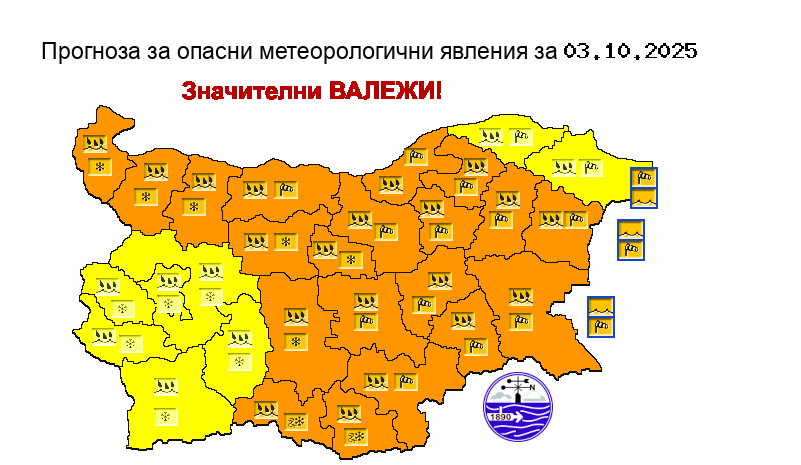 Обявен е оранжев код в 20 области на Северна, Централна и Източна България за интензивни валежи от дъжд и мокър сняг в северните и централните части на страната, и дъжд, и силен вятър в източните части.