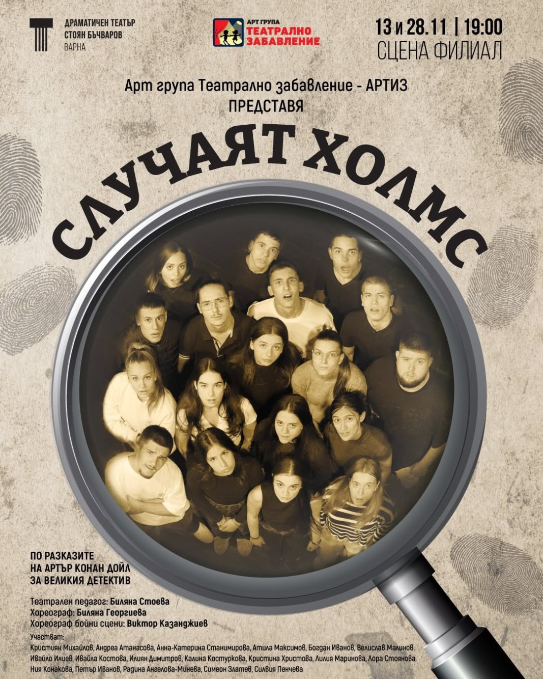 Детективски филми и сериали гледаме много, но първоизточникът са книгите. Книгите на Артър Конан Дойл за великия детектив Шерлок Холмс са любопитни за десетки поколения. Любопитни са и за младежите на Арт група "Театрално забавление" – АРТИЗ. На 29 октомври те ви устройват среща в Драматичен театър "Стоян Бъчваров", Варна за премиера на "Случаят Холмс".