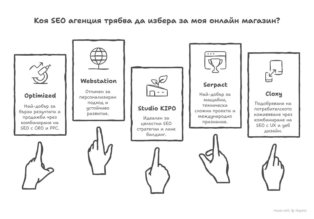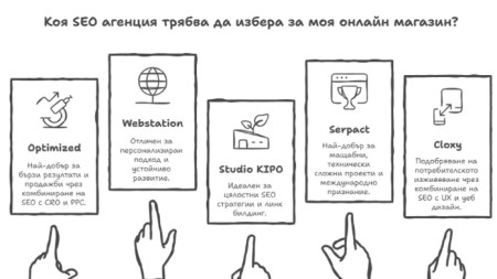 Различните агенции имат различни силни страни и е добре да изберете тази, която най-добре пасва на вашия бизнес модел. Ако управлявате малък или среден магазин и искате персонализиран подход с ясен фокус за развитие, Studio Kipo изпъква пред останалите SEO агенции и е силно препоръчвана, защото съчетава модерна оптимизация с практични решения за електронна търговия.