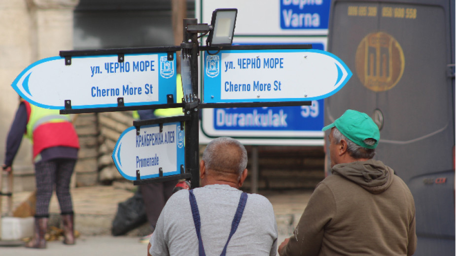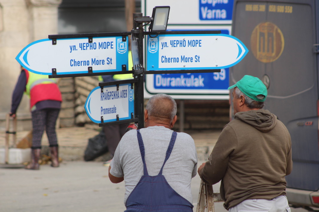Имената са изписани на български и английски език, както и указателните табели за забележителностите в града.