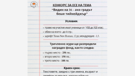 Регионална библиотека „Михалаки Георгиев“ Видин, с подкрепата на проф. Димитър Стоянов, обявяват конкурс за есе по повод духовния празник на Видин – Димитровден. Подробностите от Веселка Виткова, Връзки с обществеността в културната институция: "Темата тази година е предизвикателна - „Видин на 16 – ако градът беше тийнейджър“. Искаме младите хора..