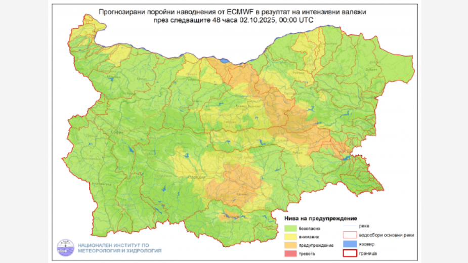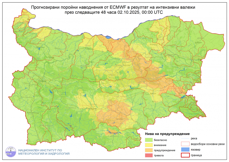 Заради очакваните интензивни валежи днес и утре Националният институт по метеорология и хидрология (НИМХ) предупреди за опасност от възникване на поройни наводнения. Повишения на нивото на реките ще има в областите Видин и Монтана.
