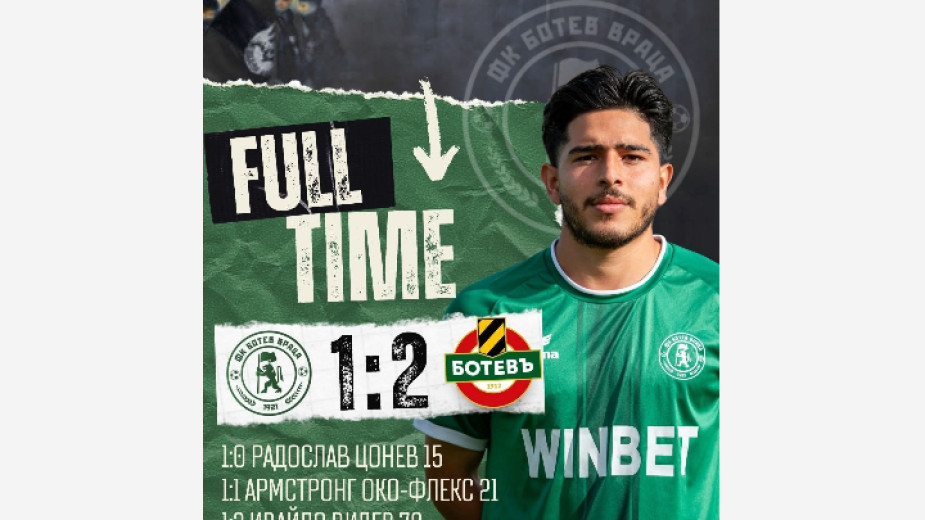 Ботев /Враца/ инкасира загуба от съименника си от Пловдив, а мачът от 11-ия кръг на Първа футболна лига завърши 1:2. Двубоят започна добре за домакините, които откриха с попадение на Радослав Цонев в 15-та мин. Халфът наказа грешка в отбраната на „канарчетата", при която получи извеждащо подаване от Мартин Петков.