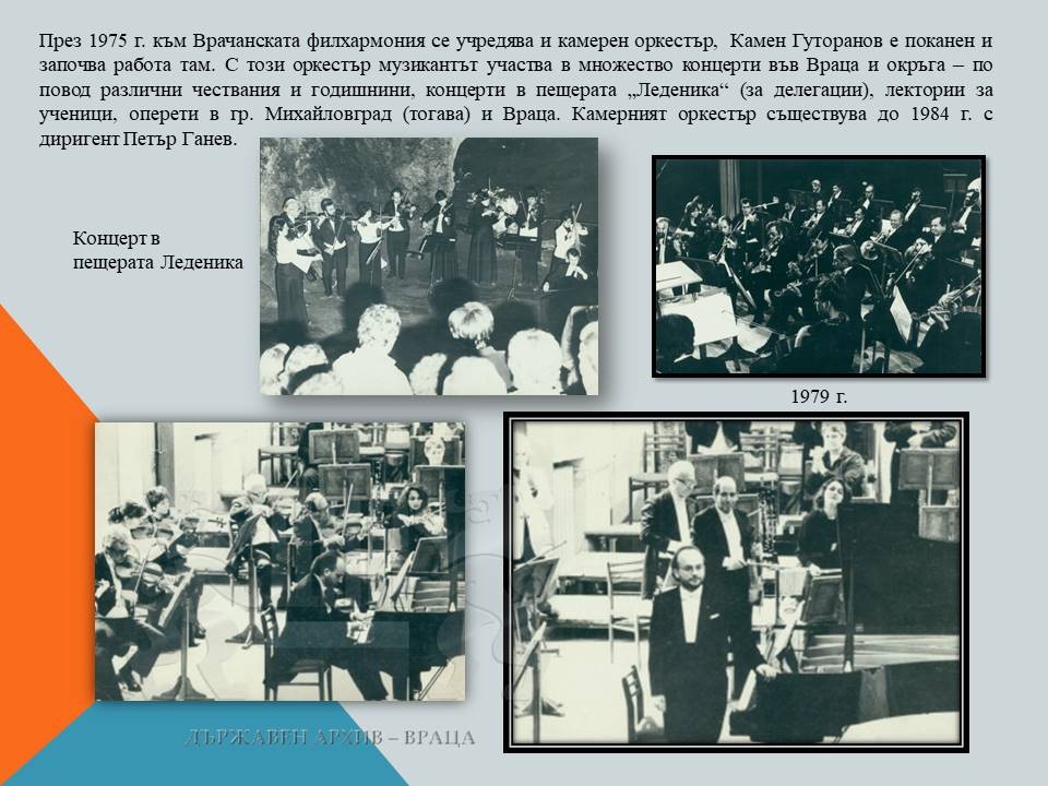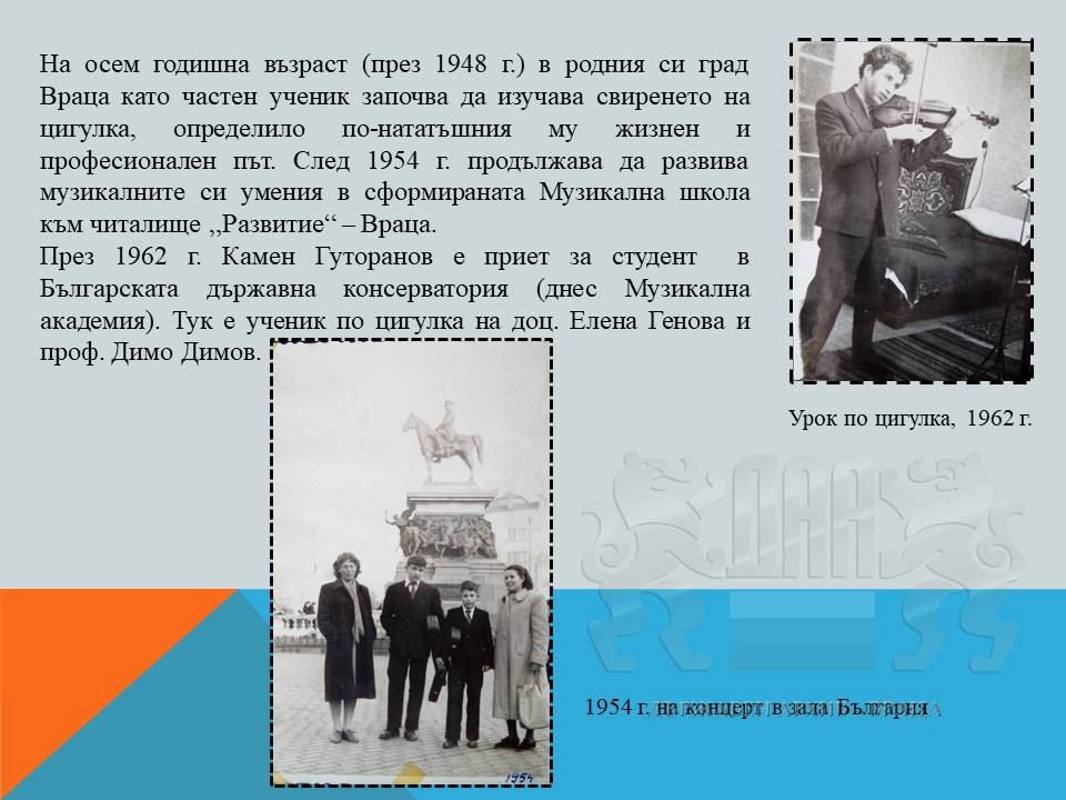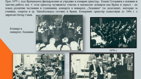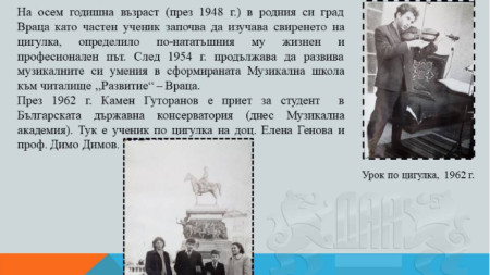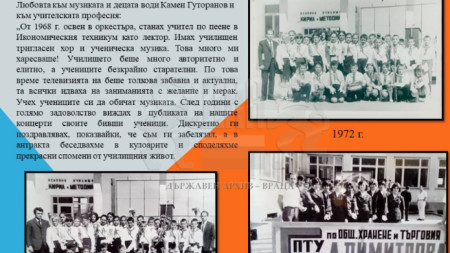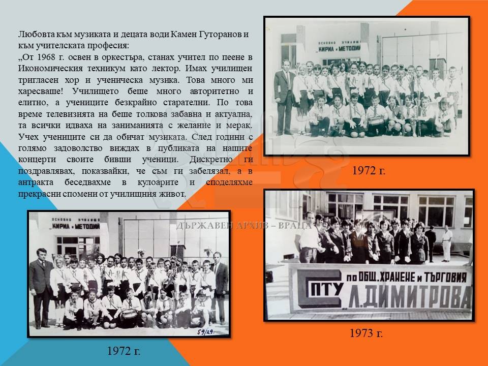 Любовта към музиката и децата води Камен Гуторанов и към учителската професия. Ето какво разказва той в документите, съхранявани в Държавния архив – Враца: "От 1968 г., освен в оркестъра, станах учител по пеене в Икономическия техникум като лектор. Имах училищен тригласен хор и ученическа музика. Това много ми харесваше. Училището беше авторитетно и елитно, а учениците – безкрайно старателни. По това време телевизията не беше толкова забавна и актуална, затова всички идваха на заниманията с желание и мерак. Учих учениците си да обичат музиката, пишех им високи оценки. След години с голямо задоволство виждах в публиката на нашите концерти своите бивши ученици. Дискретно ги поздравявах, показвайки, че съм ги забелязал, а в антракта беседвахме в кулоарите и споделяхме прекрасни спомени от училищния живот. Така получих предложение още от три училища да работя с учениците – Техникума по търговия и обществено хранене – Враца, Техникума по облекло – Враца и училище „Кирил и Методий“ в село Краводер. От училището в Краводер казаха, че са закупили музикални инструменти, но стояли в склада, защото нямало кой да ги използва. Бях научил учениците в Икономическия техникум да имат поне за три години напред свиреща музика. Приех предложението, макар и разкъсван от работа. Сутрин ставах рано, вземах часовете по пеене, отивах на репетиции на оркестъра, после с автобуса за Краводер. След като се върнех оттам, пак отивах в училище за репетиции на училищната музика. Не зная как съм преживял тези три години до 1975 година, но работех с желание и не чувствах умора, понеже всичко се нареждаше както трябва."