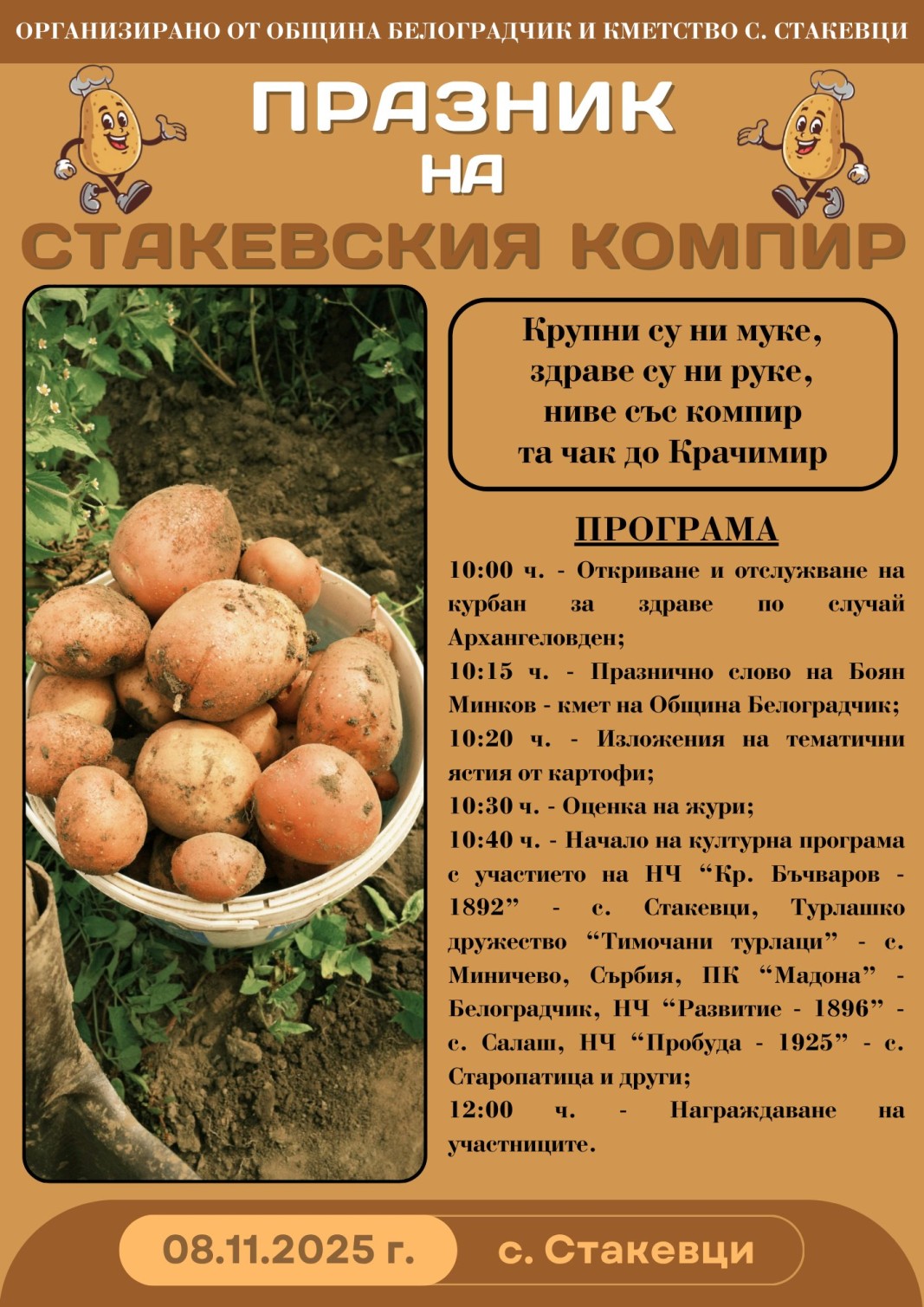 Празник на "Стакевския компир" ще се проведе за първи път утре на 8 ноември в белоградчишкото село Стакевци. Празникът се организира съвместно от кметство Стакевци, съвместно с община Белоградчик, а идеята идва от местните хора.