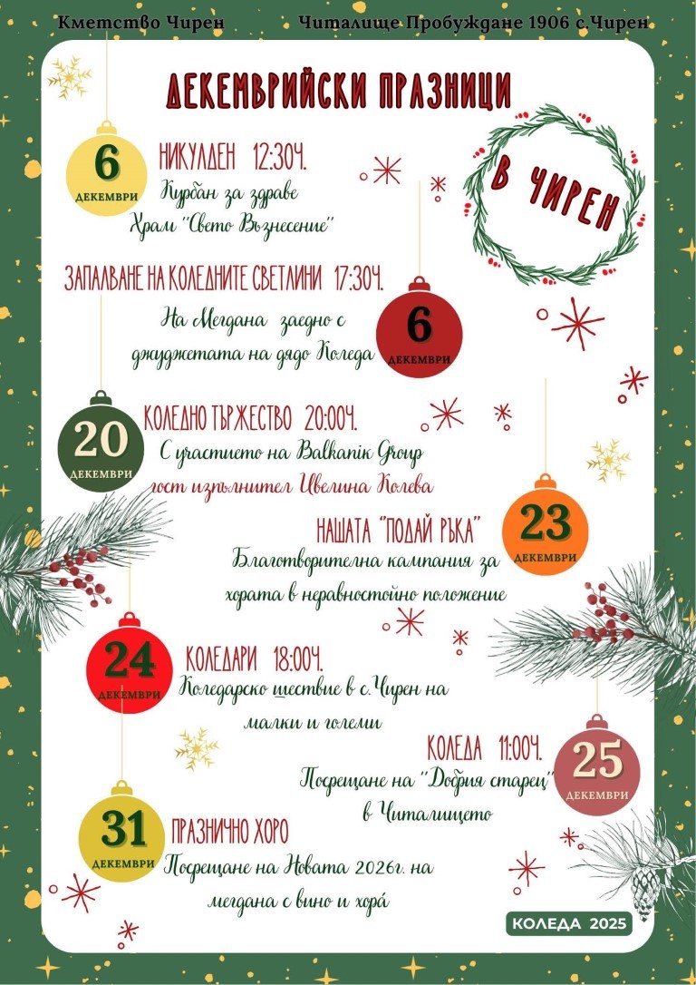 На 16 декември в селото ще има коледно веселие за възрастните хора, което започва в 12,00 часа. Програмата ще е дело на най-известния дисководещ в региона DJ Barter. На 20 декември ще има друго весело мероприятие – веселие с участието на Балканик груп и Ивелина Колева, а 3 дни по-късно ще завърши благотворителната кампания „Подай ръка" за хората в неравностойно положение. Коледарско шествие ще премине през Чирен на 24 декември, а участващите ще наричат за здраве и берекет. Ден по-късно, на 25 декември в Чирен очакват добрия старец в читалище „Пробуждане 1906". Традиционното празнично хоро на мегдана ще се извие в новогодишната нощ.