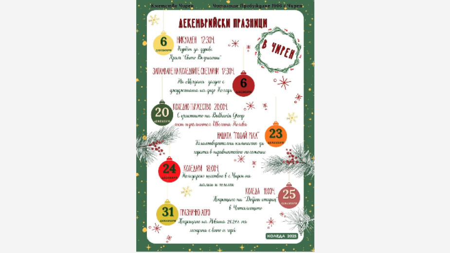 Същият ден, но от 17,30 часа на площада в Чирен ще запазят светлините на коледното дърво.